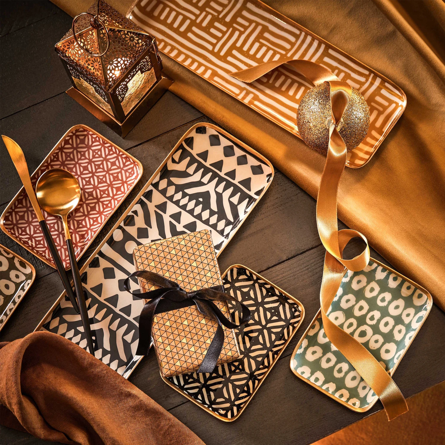 In einem raffinierten Schmelzvorgang entsteht die wunderschöne Emaille-Oberfläche des Pattery Dekotablett Aluminium. Das grafische Muster wird von einer Kante in Gold gerahmt, woraus ein moderner und zugleich eleganter Look entsteht. Sie nutzen das außergewöhnliche Tablett z.B. für Nüsse und Tannenzapfen, als Schmuckablage oder als dekorativen Hingucker im Bad. Mit Pads an der Unterseite zum Schutz empfindlicher Oberflächen. In verschiedenen Farben und Größen erhältlich, ideal auch zum Kombinieren.
