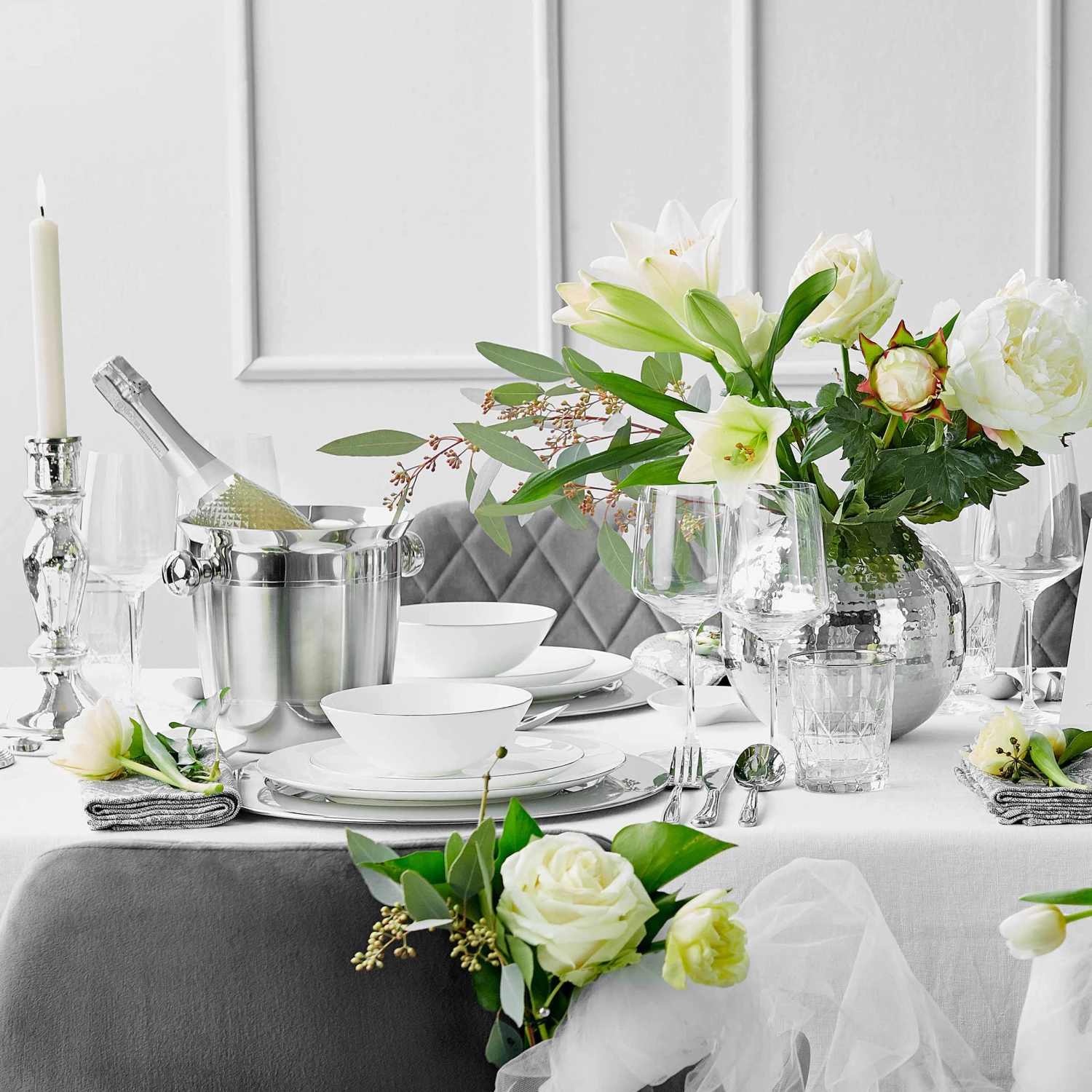 Kühle 8 Grad Celsius für Sekt und Champagner und frische 10 – 12 Grad für Weißwein – das empfehlen Weinkenner. Also nehmen Sie eine große Portion Eis, den Champagne-Flaschenkühler – und lassen die Korken knallen. Klassische Form.