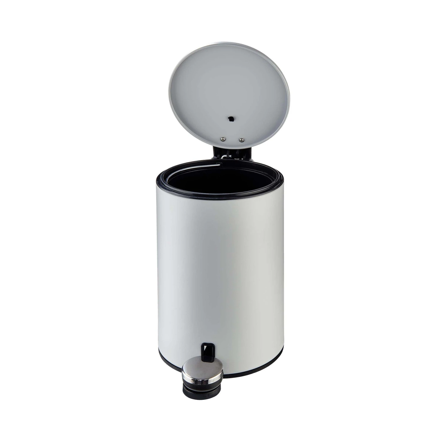 Der Treteimer hat eine schlichte zylinderartige Form, sodass er zu jedem Einrichtungsstil passt.