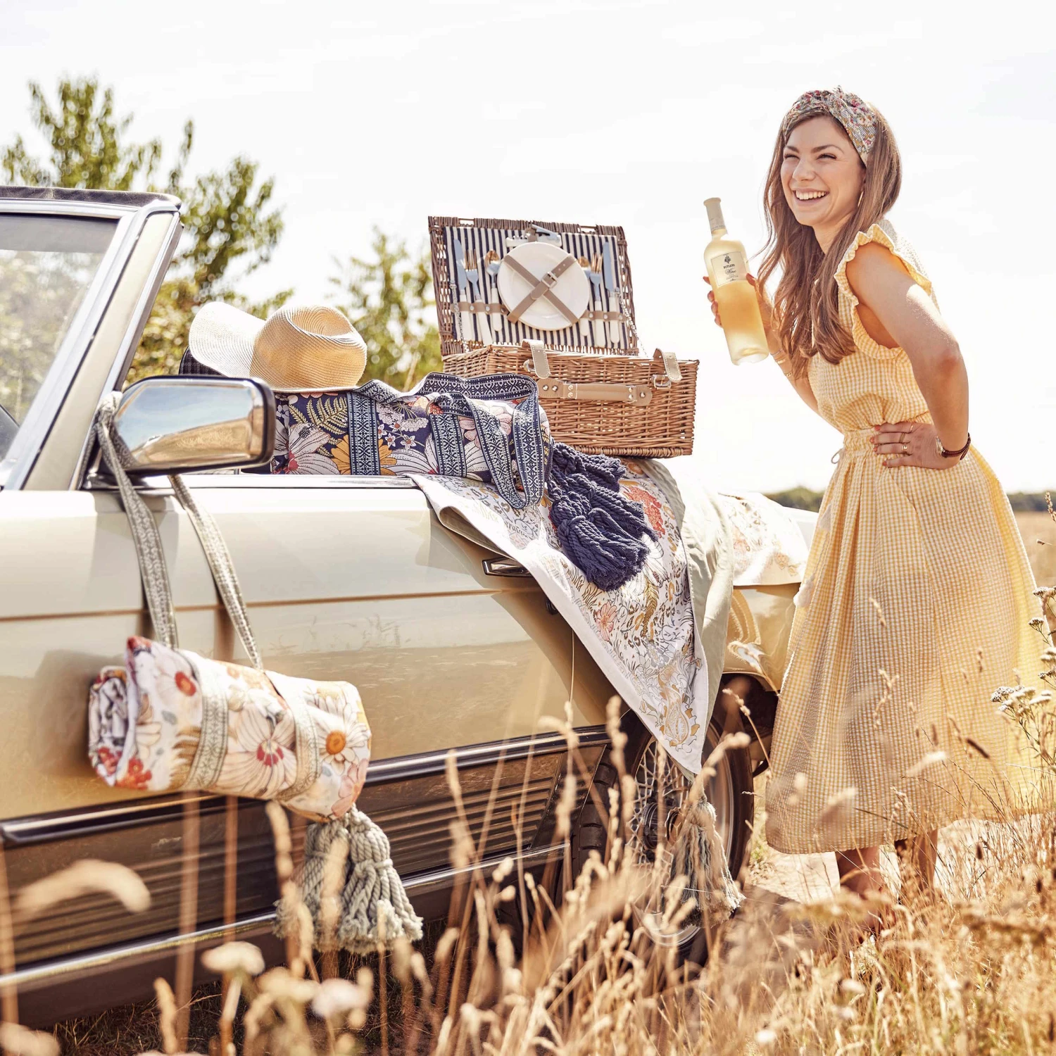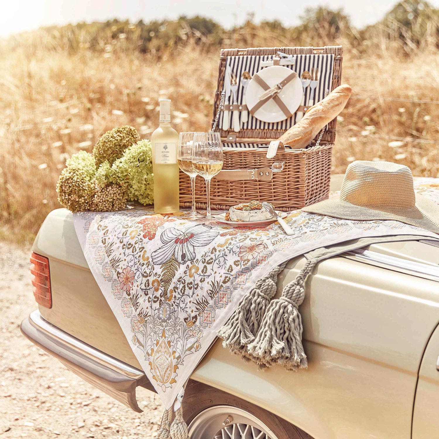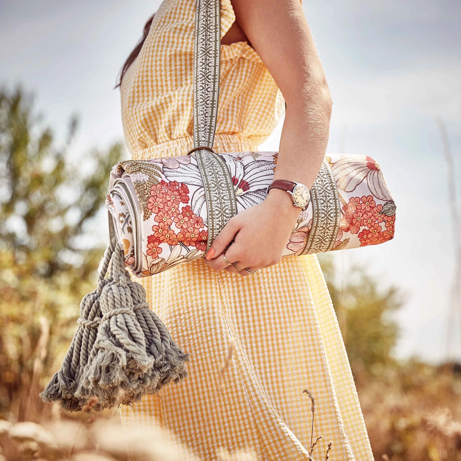 Auch wenn Sie auf der grünen Wiese oder am Strand sitzen, picknicken Sie inmitten von hübschen Blumen mit der Between Flowers Picknickdecke. Diese dekorative Picknickdecke im angesagten Boho-Stil mit Troddeln bringt praktischerweise einen optisch perfekt harmonierenden Tragegurt mit, so dass Sie sich die Decke einfach umhängen können. Aus reiner Baumwolle, Rückseite uni, in Creme und Blau erhältlich.