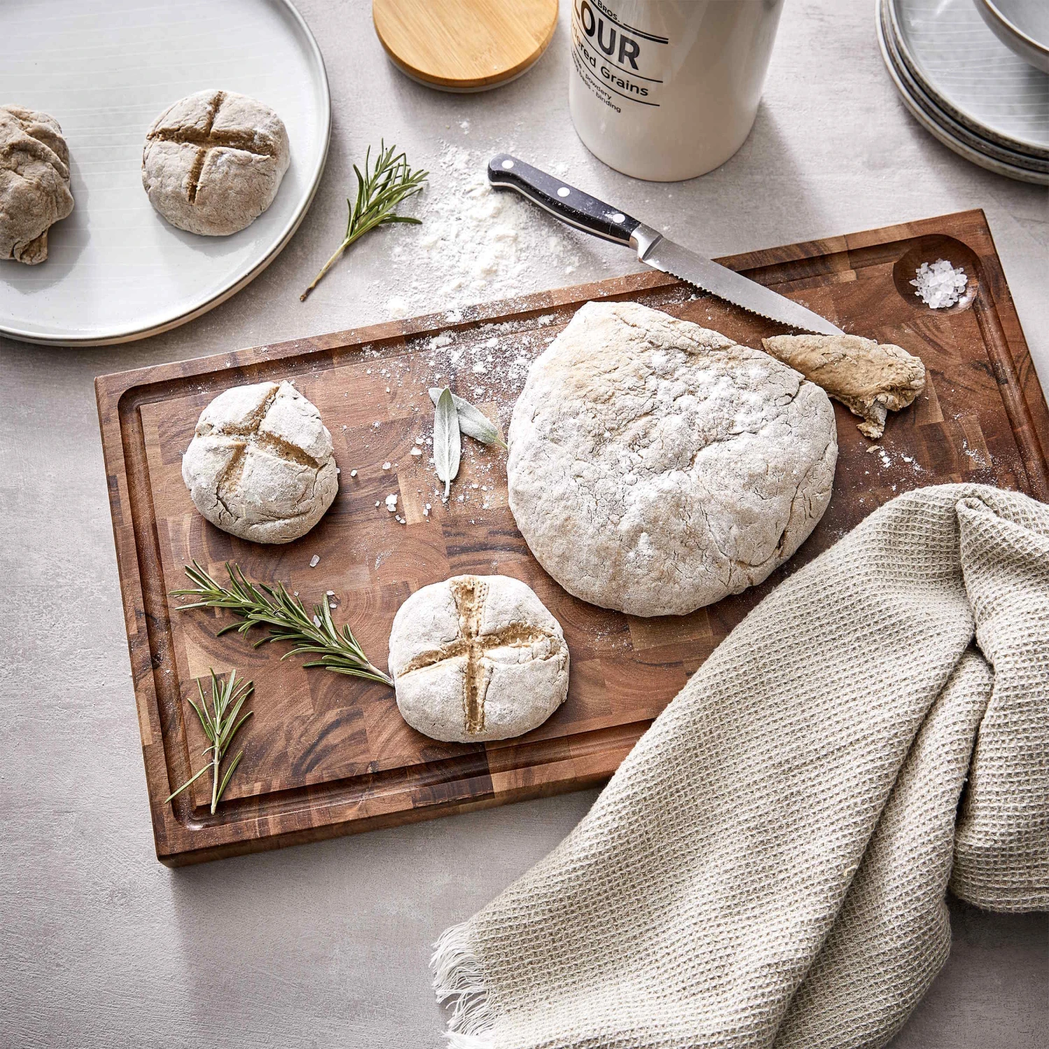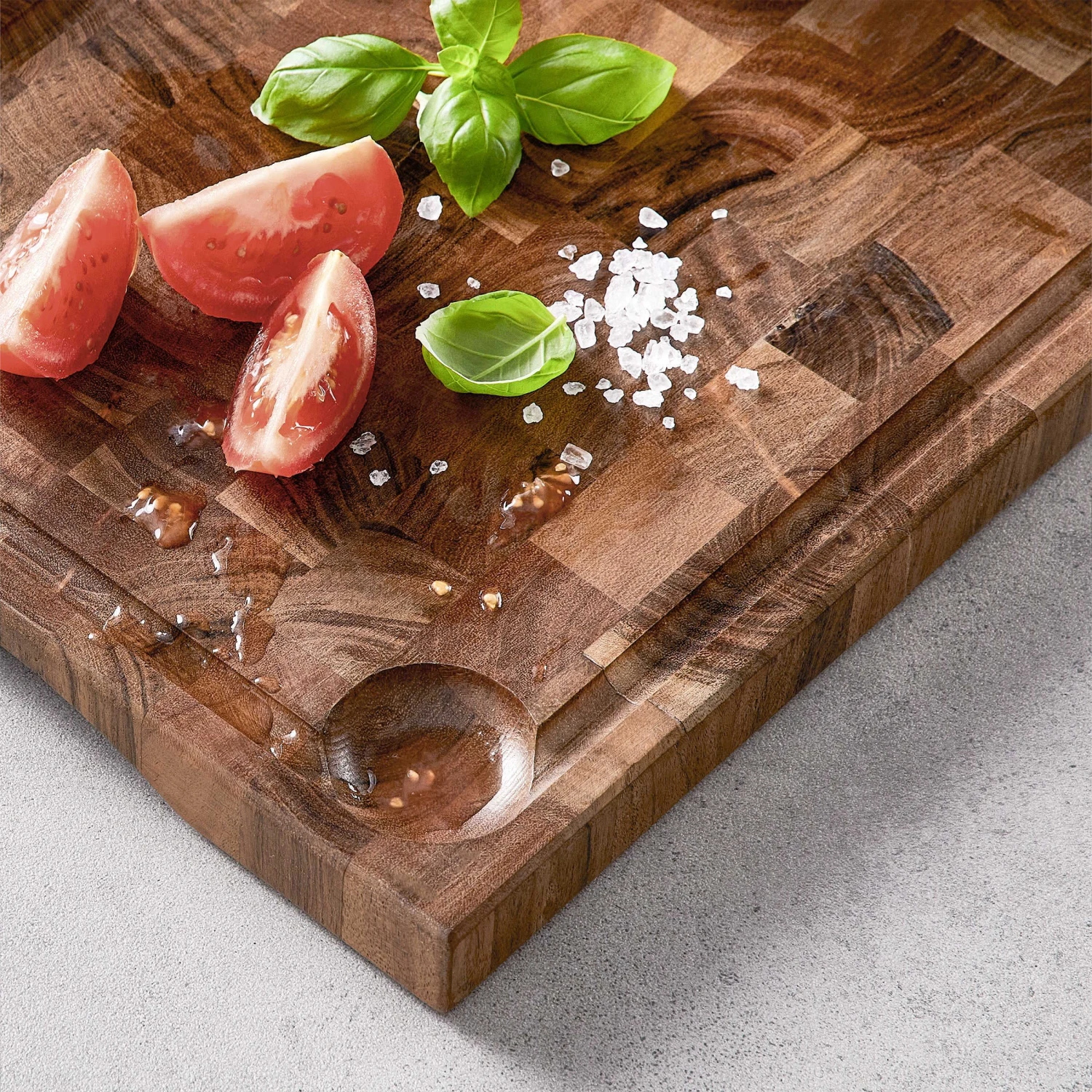 An dem hochwertigen Acacia Schneidebrett mit Saftrille werden Sie über Jahre hinweg Ihre schönste Freude haben. Kunstvolle, von Hand gelegte Intarsien verleihen jedem Acacia Schneidebrett einen individuellen Look und machen es zu einem Einzelstück. Bei der Küchenarbeit erweist sich das feinporige Akazienholz als besonders messerschonend, und es nimmt wenig Flüssigkeit auf. Sinn für das Praktische beweisen auch die Saftrille und praktische Kräuterablage. Ideal für Hobbyköche und in der Küche genau so unverzichtbar wie gute Messer, Töpfe und Pfannen.